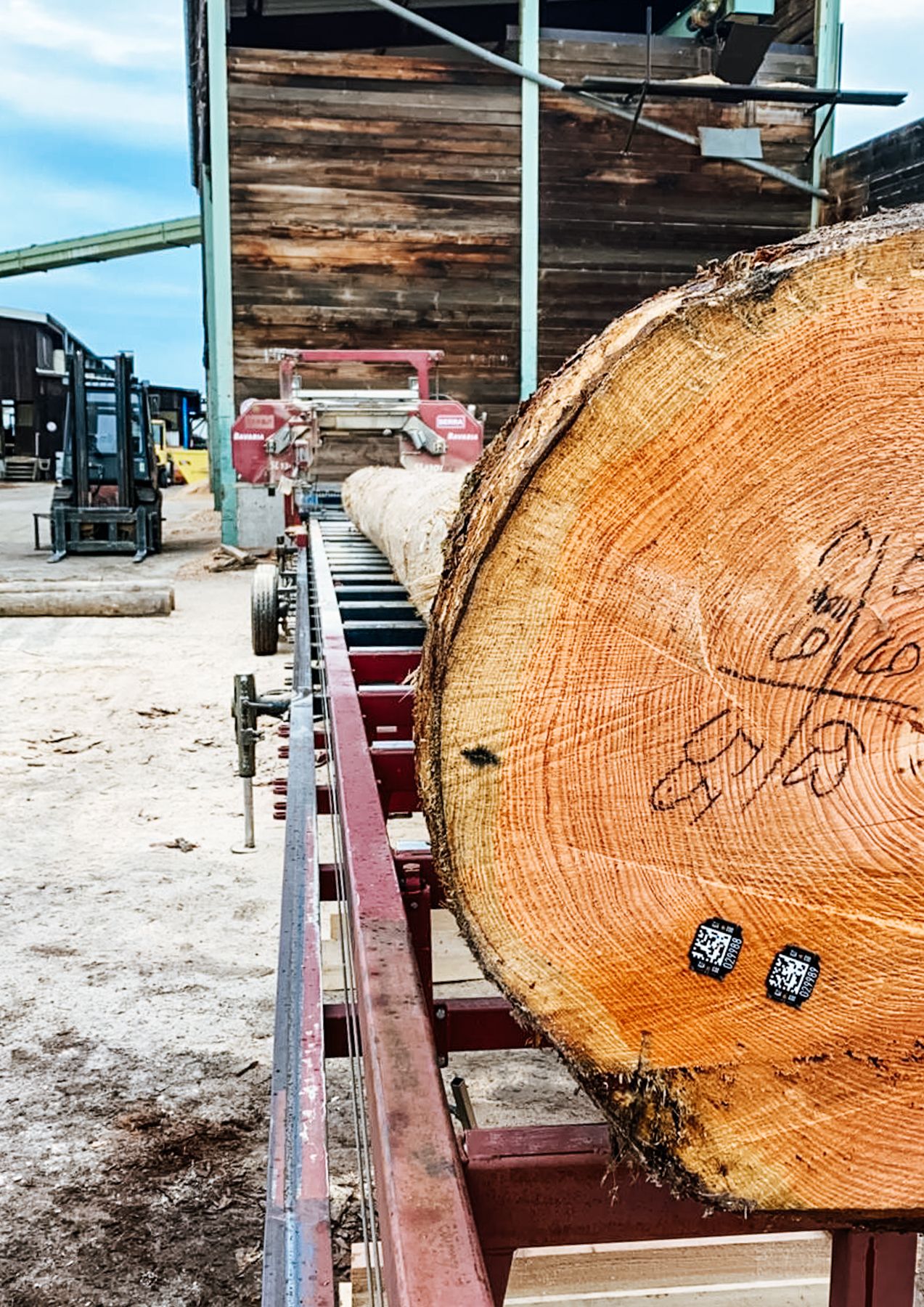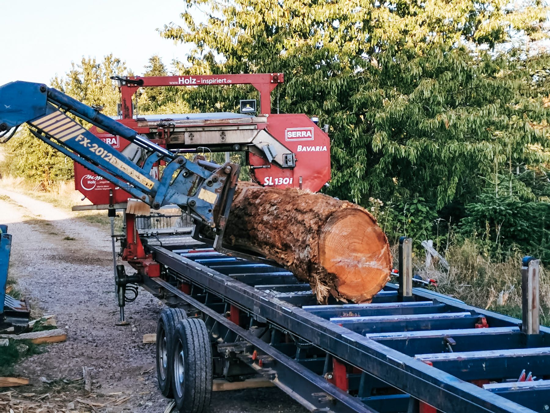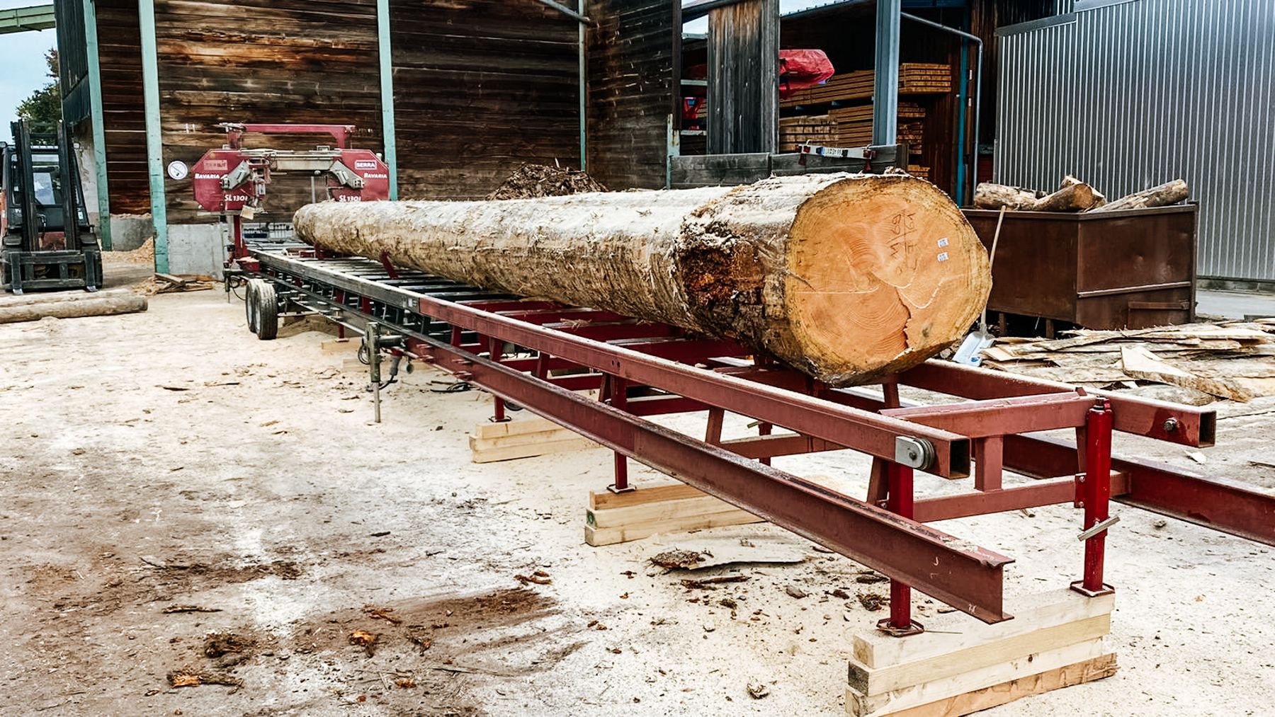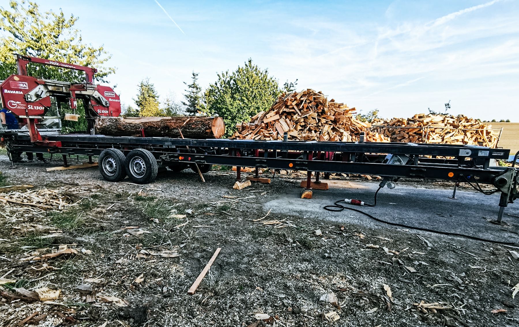 Mit dem mobilen Sägewerk SL 130i sind wir in der Lage Stämme von einem Durchmesser bis zu 130 cm zu verarbeiten. Je nach Stammdurchmesser und Schnittdimension können wir bis zu 33 fm in 8 Stunden sägen.